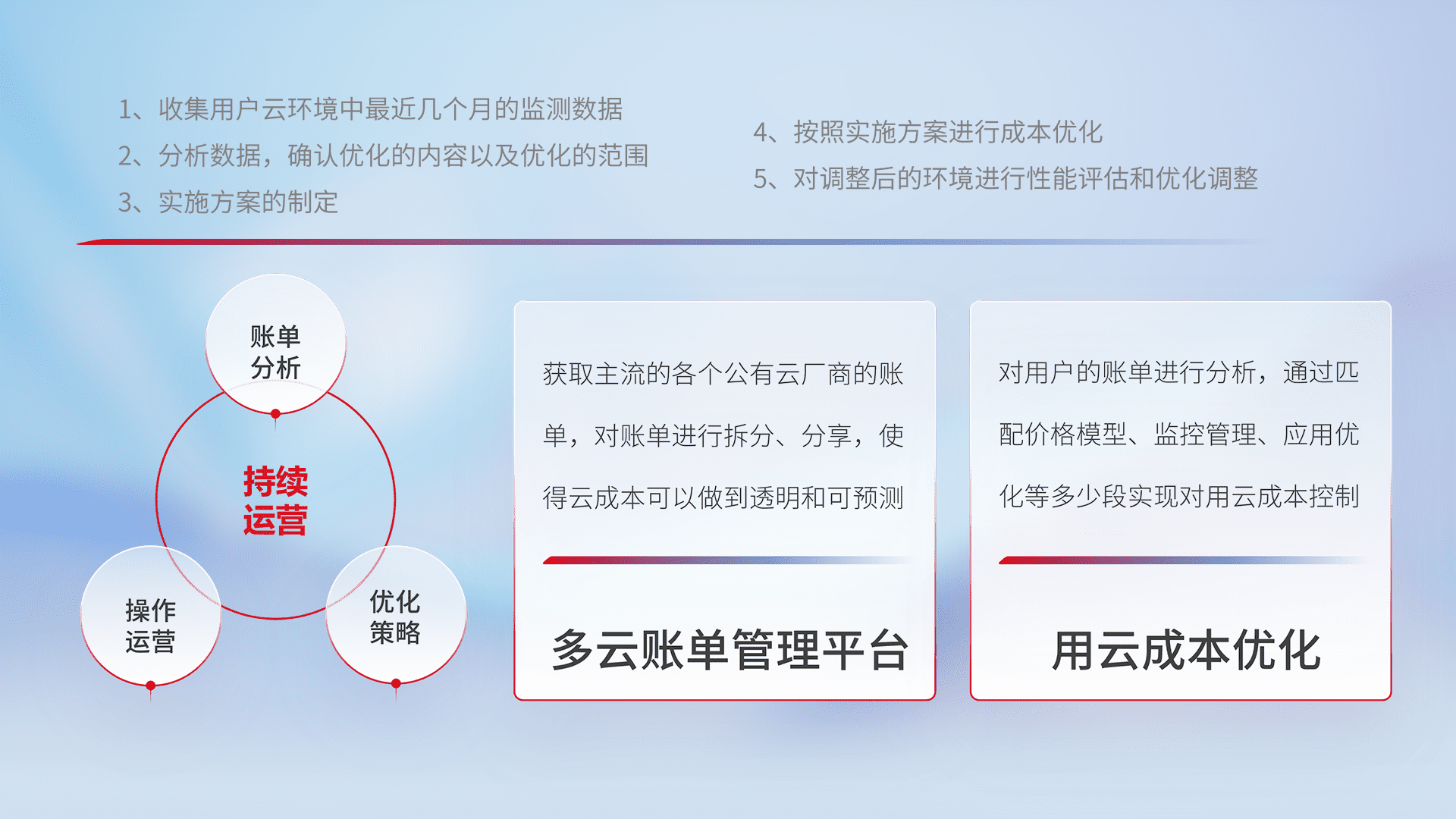 通过多云纳管,,以统一的资源数据模型把客户的云资源进行抽象和封装,,进而实现对多云资源的统一操作,,保障云资源管理的可靠性、、稳定性与可用性。。。量身定制化运维内容,,,,配置、、、、开发运维、、补丁管理、、备份、、、、监控、、、认证和访问管理、、审计和日常巡检等,,,保障在用云过程中的可靠度,,,稳定度以及高可用率。。